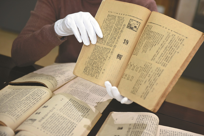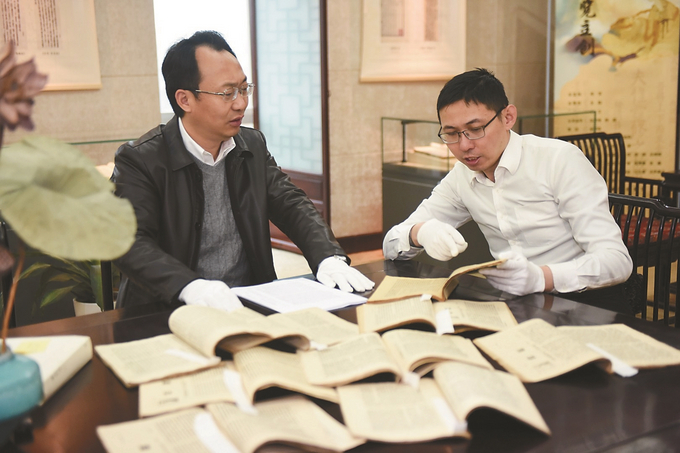 12月10日,南京图书馆馆长陈军(左)与侵华日军南京大屠杀史研究会会员胡卓然对文献进行整理研究。记者 余萍 摄