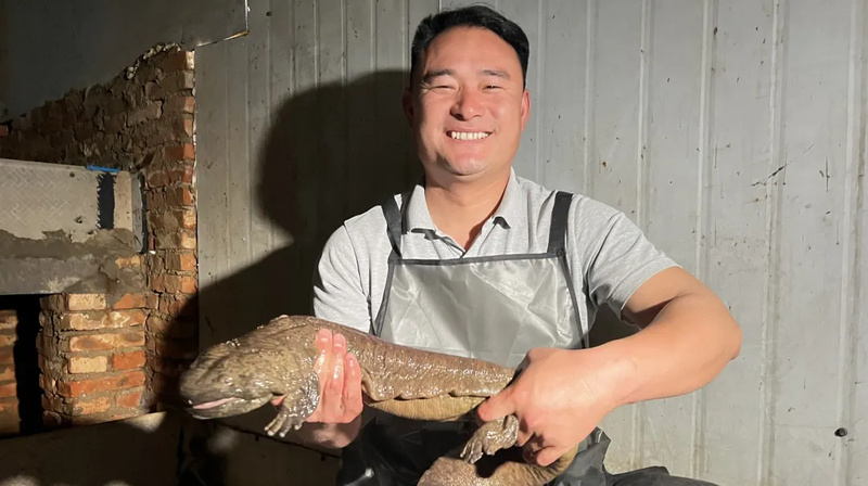 随着邱会推开一栋养殖大棚的门,温润的气息扑面而来。棚内,数十个清澈见底的养殖池整齐排列,水温被严格控制在15—18℃之间。手电筒的光束划过水面,只见数千尾娃娃鱼摆尾巡游、自在浮沉,有的静静伏在池底,有的探出扁圆的脑袋,憨态可掬。