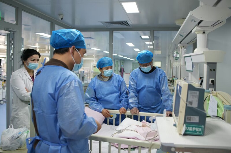 抵达喀什后,医疗团队顾不上休整,立刻前往当地医院对患儿进行全面评估。气管插管状态、肺部感染情况、呼吸道分泌物管理、生命体征监测……每一项检查都细致入微,每一个数据都关乎转运安全。